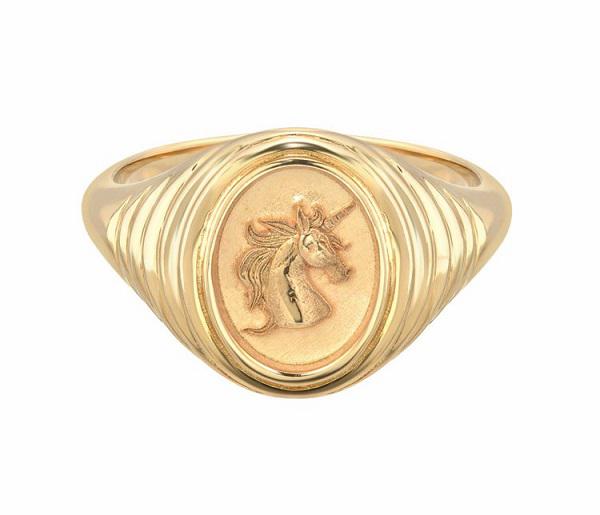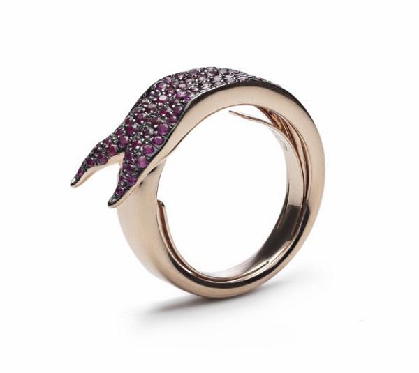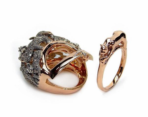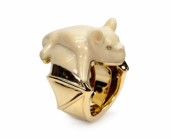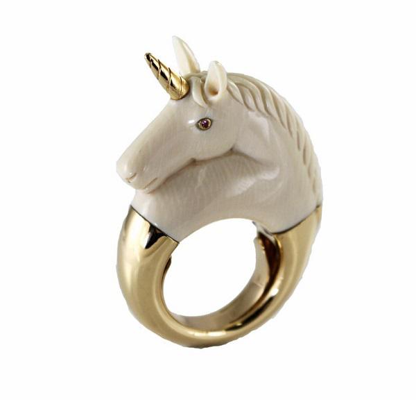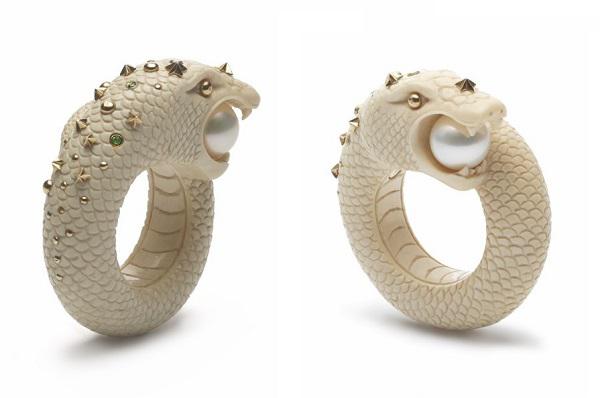 猛犸牙制作的戒指——「海蛇」戒指由完整的猛犸牙雕刻制作,表面可以看到细腻的蛇鳞纹,口中还衔着一颗珍珠;「独角兽」戒指由猛犸牙过渡为黄金,头顶的犄角雕有螺旋状纹路;「蝙蝠」戒指以猛犸牙雕刻出饱满的身形,翅膀则由金质打造,自然环绕构成戒托。