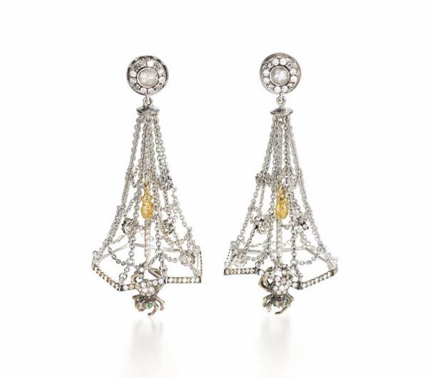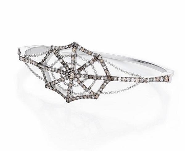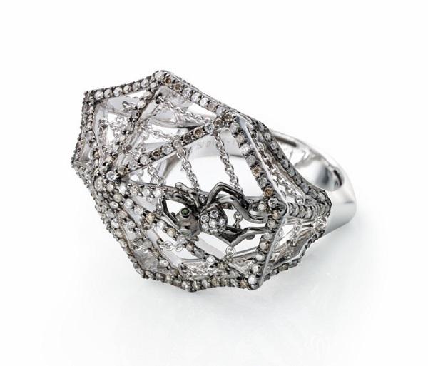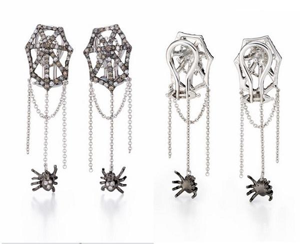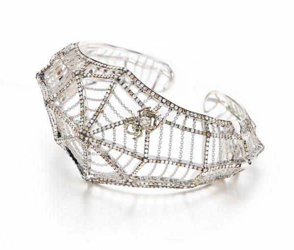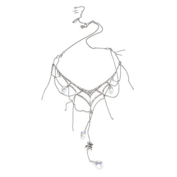 「蜘蛛」作为恐怖昆虫的代表自然不会缺席,设计师塑造出立体镂空的蛛网结构,环绕于手腕和指间,中央的蛛丝则由纤细的短链勾勒,蜘蛛造型由镀黑处理的金质打造,背部亦点缀明亮的钻石。最生动的是一条「蜘蛛」项链,蛛丝末端坠有多颗水滴形月光石,如同凝结于蛛网的露珠。