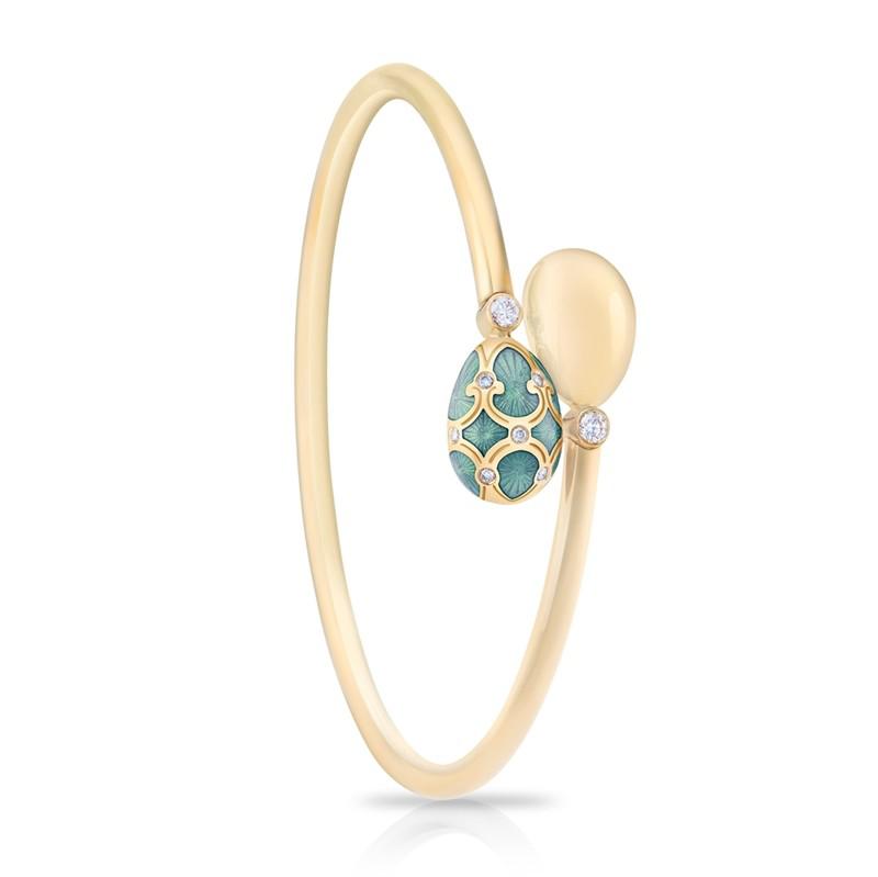 新作可选挂坠、耳坠、手镯等单品——挂坠和耳坠搭配简洁的金链装饰,随佩戴者的动作轻轻摇晃;手镯则设计为半开口结构,镯壁两端延展为2枚精巧的彩蛋,其中一枚为镜面抛光质感,另一枚则经过华丽的金雕和珐琅装饰,巧妙形成视觉对比。