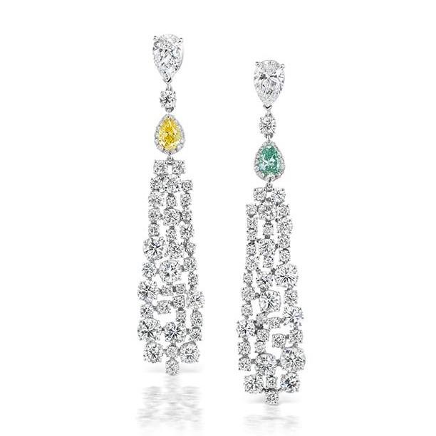 xiangshizuihualideshiyidui drop caizuanerzhui,fenbieqianyouyike fancy intense yellow shuidiqiegehuangzuan,jiyikehanjiandeshuidiqiegelanlvsezuanshi,caizuanxiafangyanshenchuzirancuoluodeyuanzuan,chengxianqingxieerxiadeliudonggan。