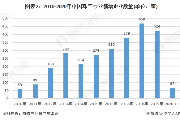 中国珠宝行业新成立企业数量整体呈增长趋势