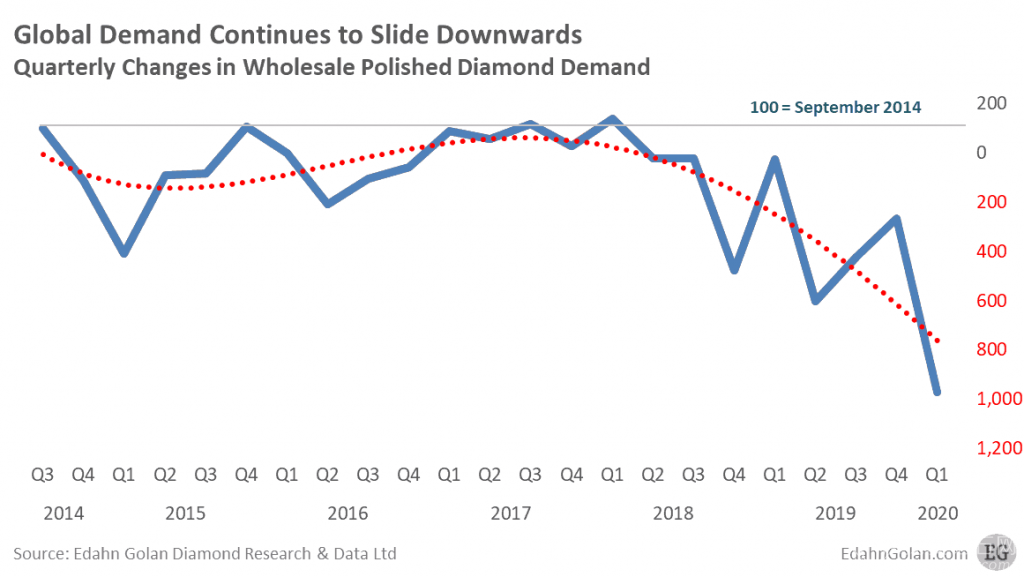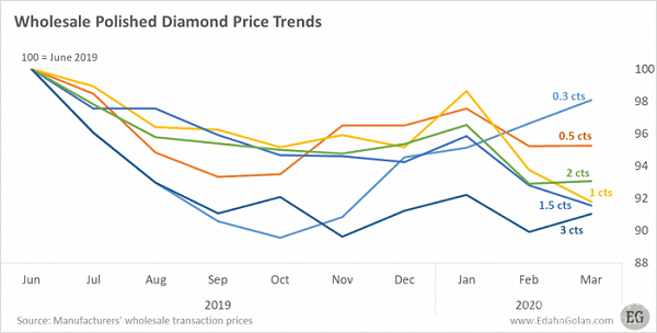xingyefenxishiaideen·gelan(edahn golan)jinqifabuleyipianbaogao,zongjiele2020niandiyijiduquanqiuzuanshixingyefazhanzhuangkuang,baogaozhichuzuanshishichangxuqiuxiadiemingxian,chengpinzuanshijiageyiyuefenshangsheng、eryuexiadie、sanyuejibenpingheng,geguozuanshimaoyizaoshoudaji,xiaoshouliangmingxianxiahuashenzhijihuweiling。