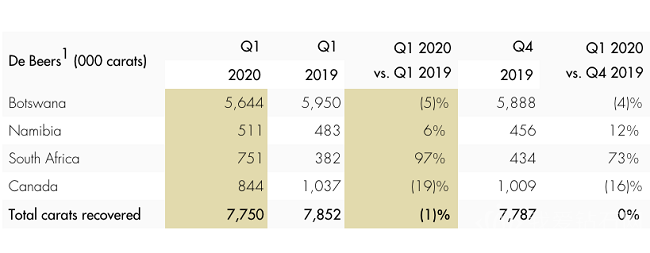 jinqi,daibiersi(de beers)gongbulejinniandiyijidudeshengchanqingkuang:yijiduzongchanliangjibenyuquniantongqichi、jianadadechanliangdafuxiajiang。shouyiqingyingxiang,daibiersiyejiangjinnianzongchanliangjihuacongyuanlaide3200-3400wankelaxiajiangzhi2500-2700wankela。