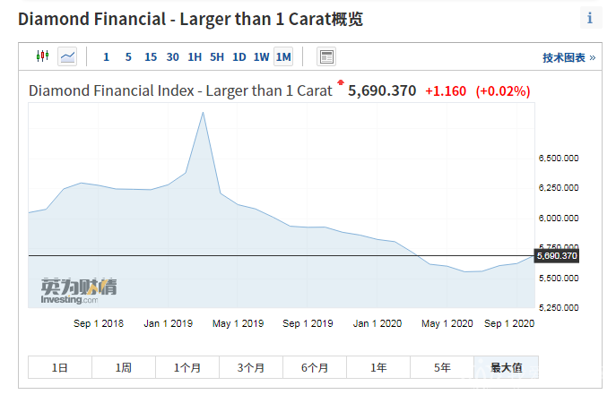 2020nian10yue,1kelayishangzuanshijiagejiagezhishu(larger than 1 carat)kaipan5621.97,jiezhi10yue31ri,shoupan5690.37,shangzhang1.22%。