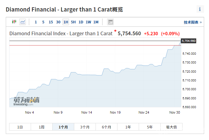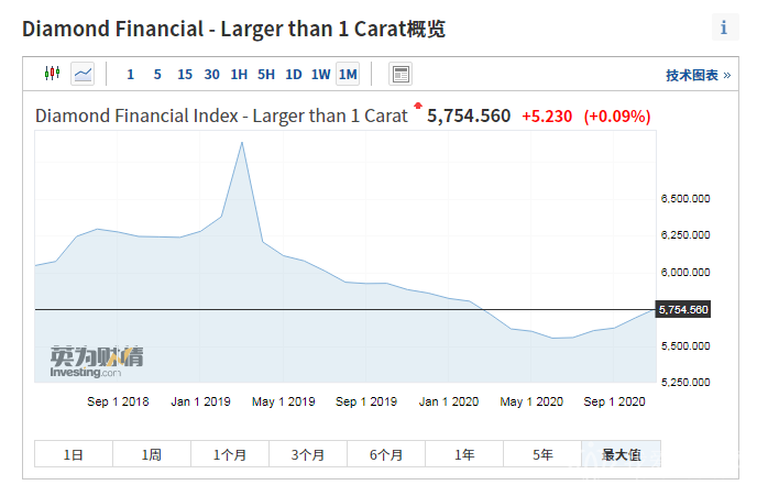 2020nian11yue,1kelayishangzuanshijiagejiagezhishu(larger than 1 carat)kaipan5690.37,jiezhi11yue30ri,shoupan5754.56,shangzhang1.13%。
