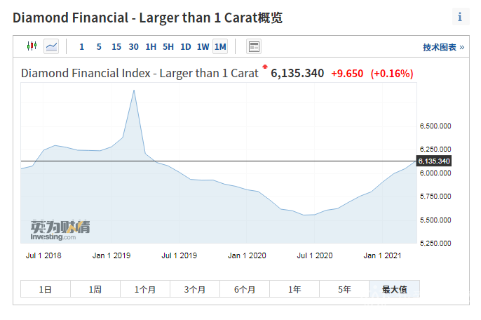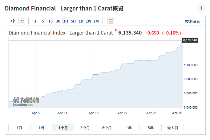 2021年4月,1克拉以上钻石价格价格指数(larger than 1 carat)kaipan6048.48,jiezhi4yue30ri,shoupan6135.34,shangzhang1.44%,jinnianyileijishangzhang5.76%。