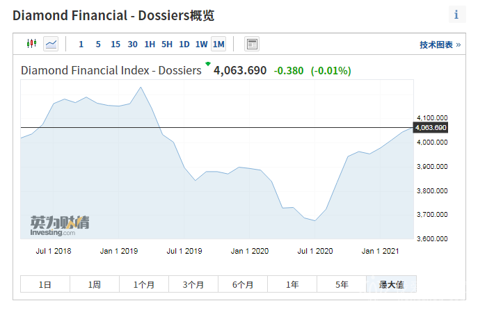2021年4月,1克拉以下钻石价格指数(dossiers)kaipan4043.39,jiezhi4yue30ri,shoupan4063.69,shangzhang0.5%,jinnianyileijishangzhang2.8%。