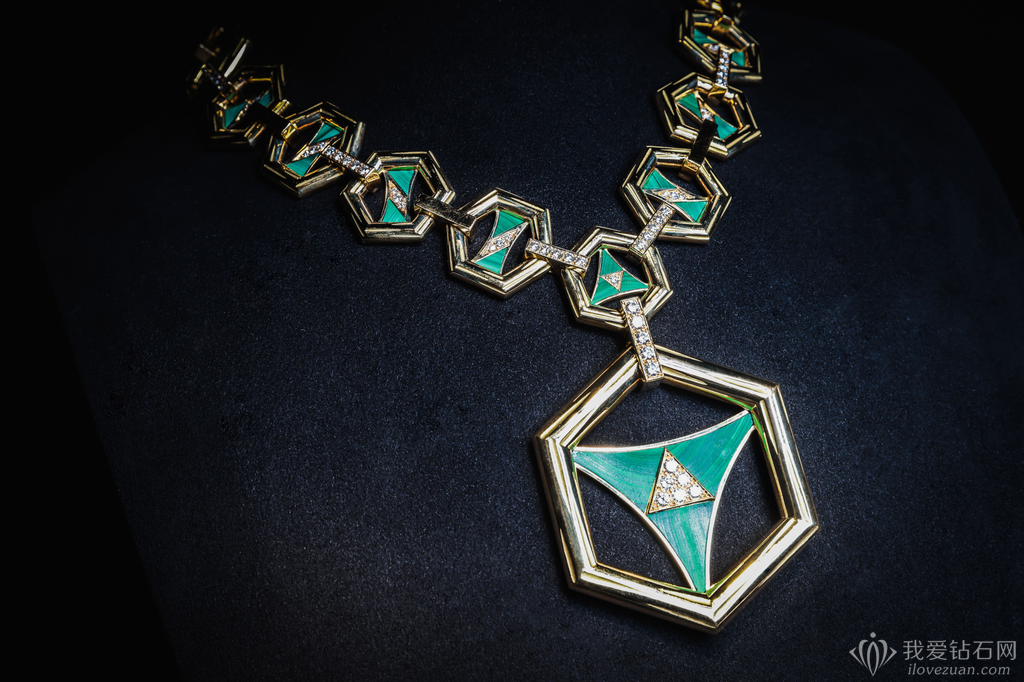 xingxingtuanshoulian,chengxianlitikongjianyubaoshiguangcaidebicihuying。zheijianzuopinyou7geluanxinglianjiezucheng,waiquanyouzuanshipuxiangercheng,chengduanmianxiaoguodehuangjinbufenzexiangneiaoxian,dangzhongxiangqianzumulv,zheiyangtupoxiangxiangdeshejixingchengdejihezhangli,touguohuangjinbiaomiandeyingshe,zumulvdeguangzeyouxushizhijianjiaoxianghuiyingdexiaoguo。