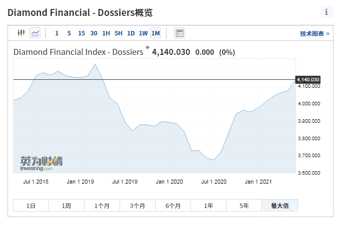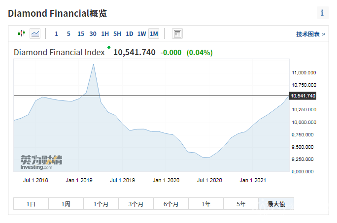 钻石价格综合指数(Diamond Financial Index)kaipan10368.67,jiezhi6yue30ri,shoupan10541.74,shangzhang1.67%,jinnianleijishangzhang7.43%。(diamond financial index yi2018nian4yuefende10,000dianweijishu)