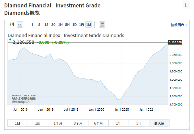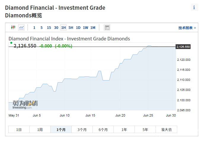投资级钻石价格指数(Investment Grade Diamonds)kaipan2097.65,jiezhi6yue30ri,shoupan2126.55,shangzhang1.38%,jinnianyileijishangzhang8.22%。