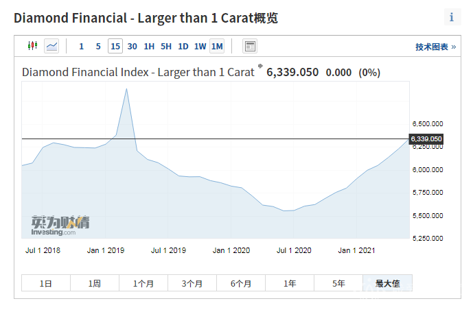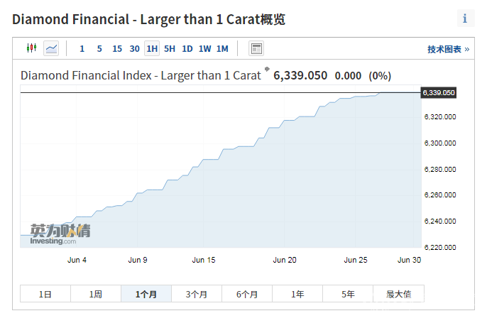 1克拉以上钻石价格价格指数(Larger than 1 Carat)kaipan6230.86,jiezhi6yue30ri,shoupan6339.05,shangzhang1.74%,jinnianyileijishangzhang9.27%。
