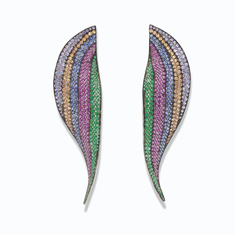 zuiyinrenzhuyideshiyiduileaferhuan,youputaoyashejishi jose manuel rosas sheji——erhuanyiyeziweizhuti,yunyongduheijinzhisuzaochuxianzhangwanzhuandeyebanxingtai,biaomianpuchenjin5ctdecaiselanbaoshihe1.29ctzumulv,guililingdongdebaoshisecaiyingzaochuziranshengmingli。