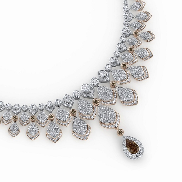 summerxiajizhutishejilingganlaizishatanxiadeyuangujushihuashi——zuihualideshiyijianhuangzuanjinglian,zhushixiangqianyikezhongda9.06ctzhenxingnongcaihuangzuan,liuluchuwennuanmingliangdehuocai。huangjinjinglian「xuehuaxiangqian」zuanshi,zhongjianshiyiyiquanfangxingqiegezuanshilingganlaizishiqianshengwudejizhui。liangdianshijinglianbeibuliankouchuiluoyimeiluoxuantuanguazhui,zaixianjushihuashideluoxuanwenli,zhongyangxiangqianyikehuangzuanyuanshiyingzaochuyuanshizhipodeguangze。