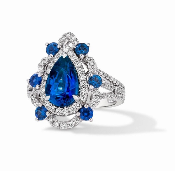 "蓝色宝石"系列汇集大颗粒斯里兰卡蓝宝石和坦桑石——一枚 Maise 铂金戒指镶嵌一颗斯里兰卡产地3.03ct水滴形切割矢车菊蓝色蓝宝石,外圈运用钻石和蓝宝石勾勒出镂空花边轮廓;一件 Zahra 金质项链则镶嵌11颗枕形弧面切割坦桑石,总重约达175ct。