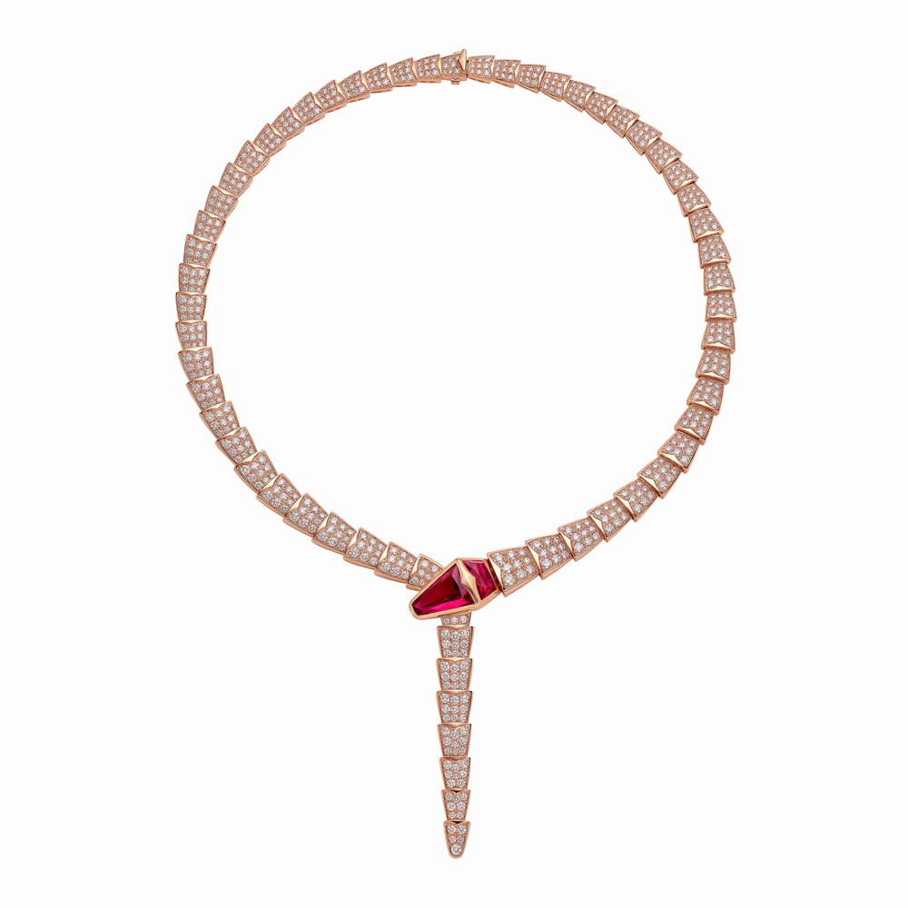 除此之外,BVLGARI 还特别推出一款Serpenti Viper新年限定版项链,首尾相衔的设计表达对新年伊始的祝福。玫瑰金镶嵌钻石塑造出蛇鳞自然衔接的灵动结构,蛇头镶嵌2颗定制切割红碧玺成为焦点,通透饱和的红色调象征新年红运。