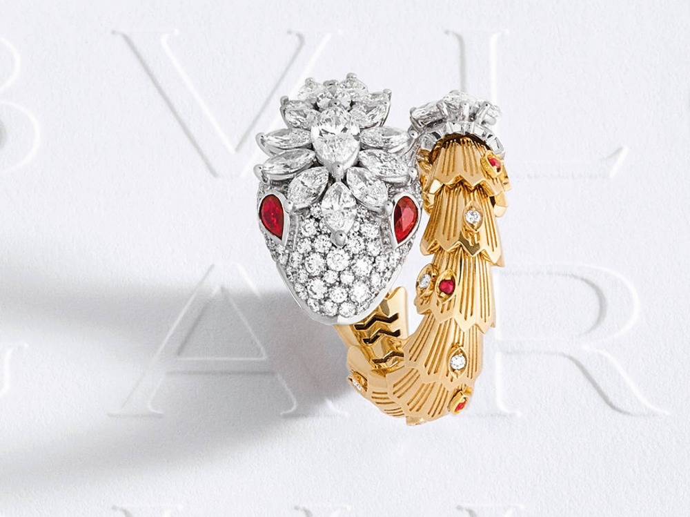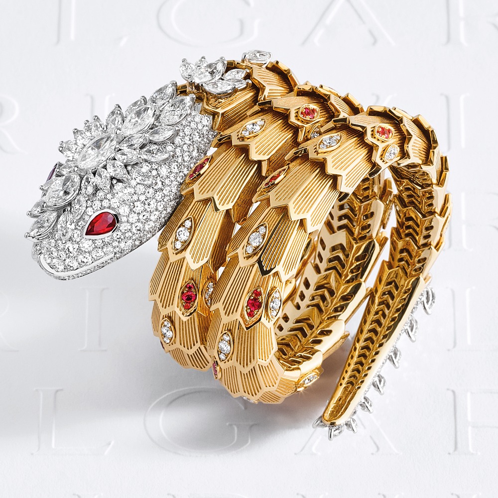 Serpenti Dragoni系列以黄金制作蜿蜒蛇身,金雕的蛇鳞镶点钻石和红宝石,鎏光灿溢宛若金龙。亮点是蛇头雪花镶嵌钻石,顶部以榄尖形钻石簇构成莲花般的图腾,与璀璨的钻石蛇尾交相辉映,蛇眼镶嵌2颗水滴形红宝石成为魅惑点睛。