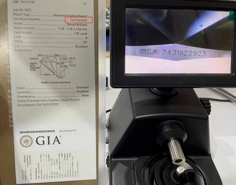 每一颗GIA裸钻在腰棱处都有一串数字,这是激光码-对应GIA证书编号,(30分以上裸石才有)通过放大镜可在钻石腰棱处见到,正版腰码GIA三个字母是“双线镂空的”。
