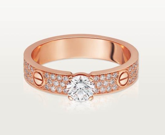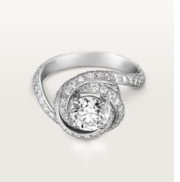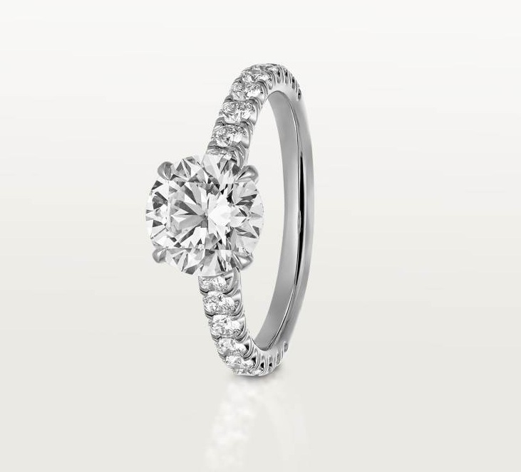 这是卡地亚的经典系列之一,950‰铂金戒指,中央镶嵌一颗重 0.23 至 5.00 克拉及以上的圆钻。1 克拉左右的戒指价格大概在 10 万左右。其设计简约优雅,能够最大程度地展现钻石的璀璨光芒,是追求经典与永恒之美的消费者的首选。