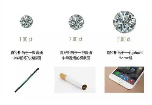 注意:相同重量的钻石,切工不同可能看起来大小有差异(例如切得薄的钻石台面更大,但火彩差)。