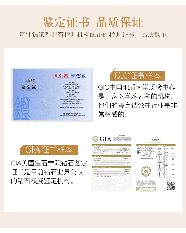 GIA国际钻石证书与国检证书,双证质保,品质无忧;
