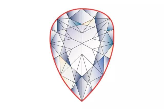 若要判断一颗梨形钻石是否对称,可以沿宝石长轴假想一条线,检查线两侧是否一致。匹配度越高,对称性就越好。注意看上图中线两侧的肩部、腹部和翼部的一致性,以及宝石两侧刻面的形状、尺寸和位置是如何一一对应起来的。