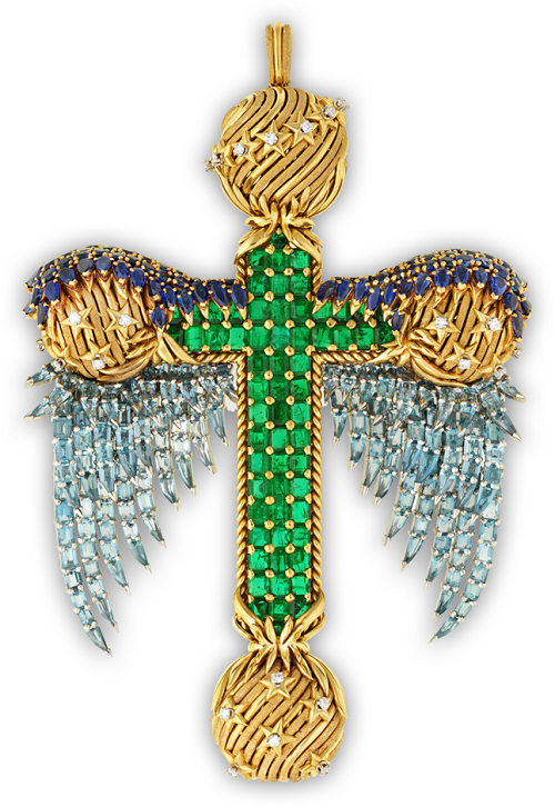 zaizongjiaozhubaoshoushishejizhong,shilongbojiejingchangjiejianouzhouzhuangshiyishuchuantongdeshiyanghetuan。shehuadexiongpeishizijiayaodaizaikaojinxinzangdezhongxinweizhi。tadezhuangmaomofangguanghuaxuanlandemeilitianti,zhongzhuheliangbeimoduanjundianzhuixingqiu,bingyongyiyishenghuidehailanbaoshizhichengkechaixiedeshoulongshuangyi。xiongpeishizijiatongchangweijidujiaoshenzhirenyuanpeidai,danputongrenyoushiyehuiyongqidaitidiaozhui。