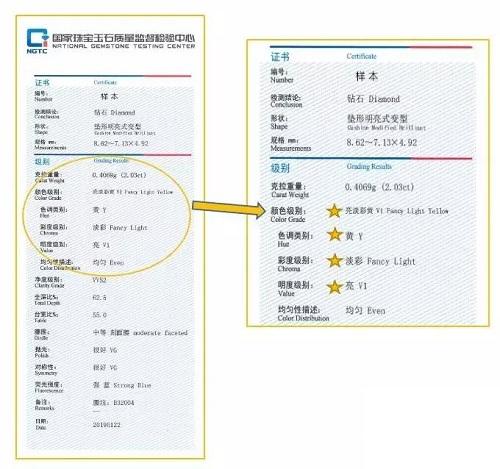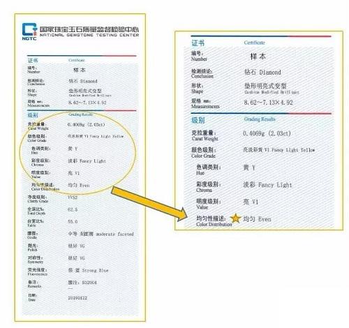 yansejibiemiaoshu:guojianbiaozhuncaiyong“mingdu + caidu + sediao”defangfaduihuangsezuanshideyansejibiejinxingbiaoshu, ruxiatuzhong,guojiazhubaoyushizhiliangjiandujianyanzhongxin(ngtc)chujudezuanshifenjizhengshuzhong,yansefenjidebiaoshuwei“liangdancaihuang v1 fancy light yellow”。