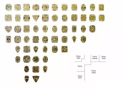 giacaizuanfenjixitongjianghuangsezuanshiyansehuafenweiliugedengji:fancy light yellow(dancai)、fancy yellow(cai)、fancy intense yellow(nongcai)、fancy vivid yellow(yancai)、fancy deep yellow(shencai)、fancy dark yellow(ancai)。tongsudelaishuo,huangzuandeyuemingyanyansedengjiyuegao。