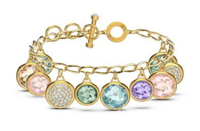 tahliashoulianjianghuopoxianmingdesecaiyujingzhidepaoguangducengxiangronghe,baokuojinse、meiguijinseheyinseduceng,yicuicanshanyaodeyuanxingqiegeshihualuoshiqifangshuijingqiaomiaodapeiliuchangdebaobianxiangqiansheji,tuxianpinpaidesecaimeixuehezhuanyejishu。