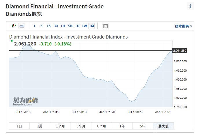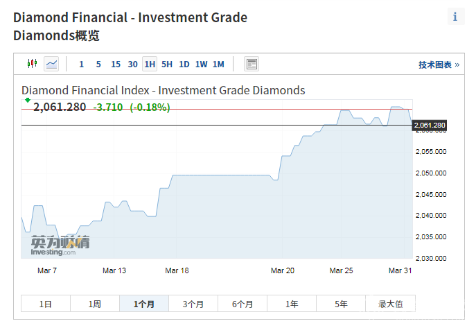 2021nian3yue,touzijizuanshijiagezhishu(investment grade diamonds)kaipan2041.62,jiezhi3yue31ri,shoupan2061.28,shangzhang0.96%,jinnianyileijishangzhang4.9%。