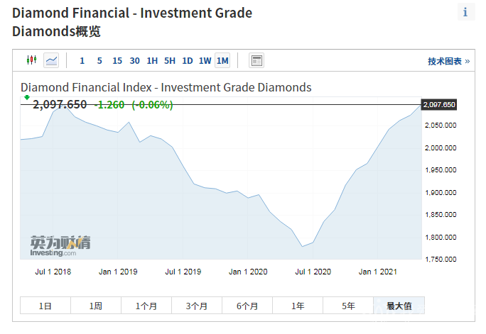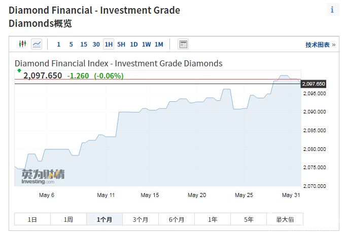 投资级钻石价格指数(Investment Grade Diamonds)kaipan2073.23,jiezhi5yue31ri,shoupan2097.65,shangzhang1.18%,jinnianyileijishangzhang6.75%。