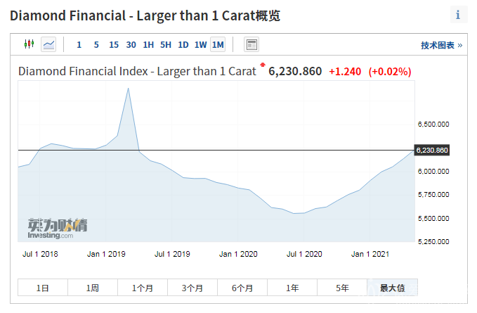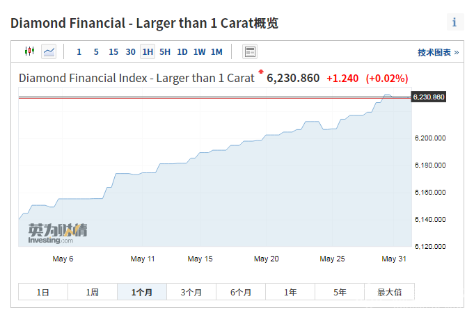 1克拉以上钻石价格价格指数(Larger than 1 Carat)kaipan6135.34,jiezhi5yue31ri,shoupan6230.86,shangzhang1.56%,jinnianyileijishangzhang7.4%。