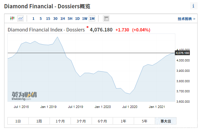 钻石价格综合指数(Diamond Financial Index)kaipan10259.99,jiezhi5yue31ri,shoupan10368.67,shangzhang1.06%,jinnianleijishangzhang5.67%。(diamond financial index yi2018nian4yuefende10,000dianweijishu)
