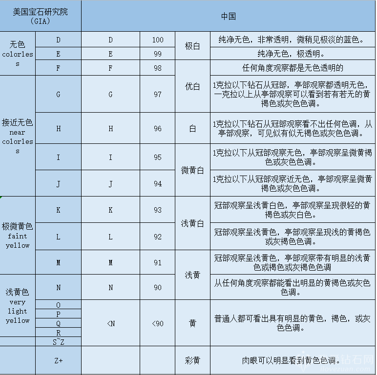 zuanshiyanseshijishangshizhizuanshiwusedechengdu。changjiandebaoshijizuanshi,youwuse-fanhuangdengbutongsediao,zuanshiyuejiejinwuse,yansejibieyuegao。giatixizhongjiangyansehuafenle23gedengji,fenbieyidef....xyzdengyingwenzimubiaoshi,yanseyicidijian。