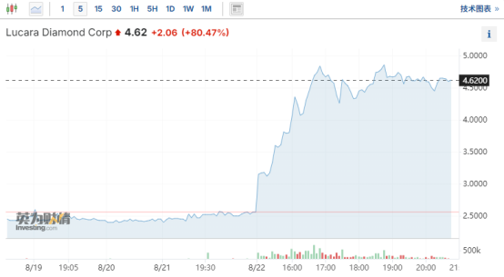 2024年8月22日,Lucara Diamond公司在瑞典斯德哥尔摩交易所交易的股票大幅上涨,一度涨超80%。