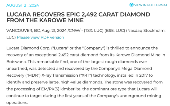 (Lucara Diamond公司官方声明。来源:lucaradiamond)
