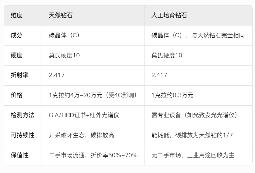 二、天然钻石和人工培育钻石差异对比表