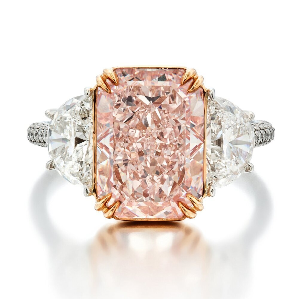 zheishibenchangchengjiaojiadiergaodepaipin,zhushiweiyike5.07ctqiejiaojuxinghunheshiqiegefenzuan,jing gia jiandingwei fancy pink sejihe vs1 jingdu,wei type iia xingzuanshi。shejishijiangzheimeifenzuanxiangqianyuyimeijiezhizhongyang,tongshiliangcexiangqian2kebanyuexingqiegewusezuanshiheyuanxingmingliangshiqiegezuanshi。