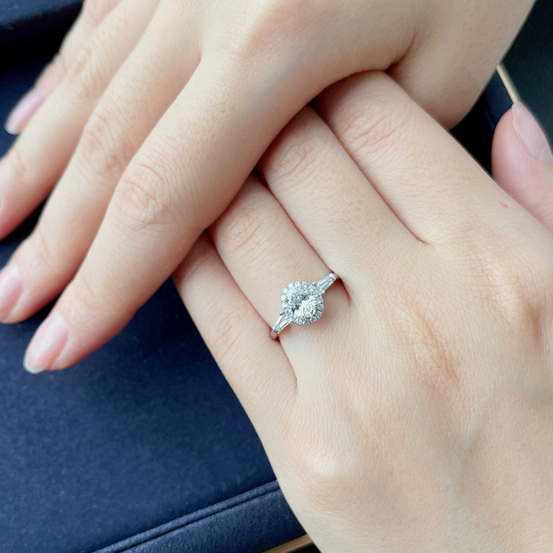 首页>异形钻戒>椭圆形 单圈围镶戒臂梯方副钻 18K金钻戒